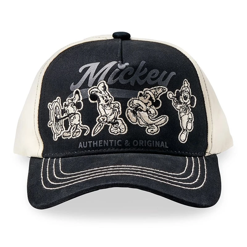 Mickey Mouse steps through his storied career on this two-toned all-cotton baseball cap featuring embroidered appliqués of his greatest roles.