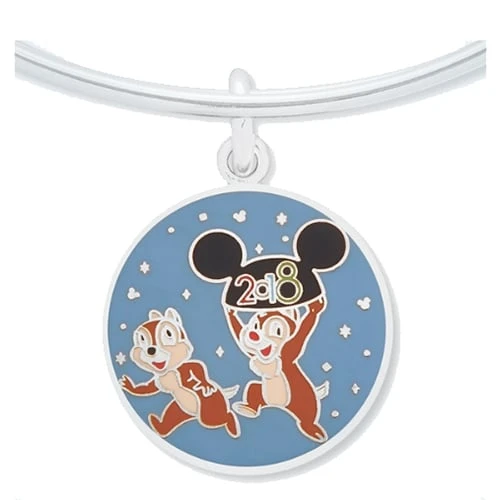 Those rascals Chip ‘n Dale are ready to celebrate the coming year as they hold up a ”2018” Mickey Mouse ear hat on this commemorative charm. Created by Alex and Ani, the enamel cloissoné design is available in polished golden or silver finishes.