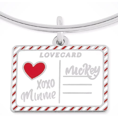 Minnie Mouse sends her love to Mickey Mouse with a postcard charm on this sweet bangle by Alex & Ani. The heart-stamped ”lovecard” charm dangles from the polished bracelet that’s available in golden and silver finishes.
