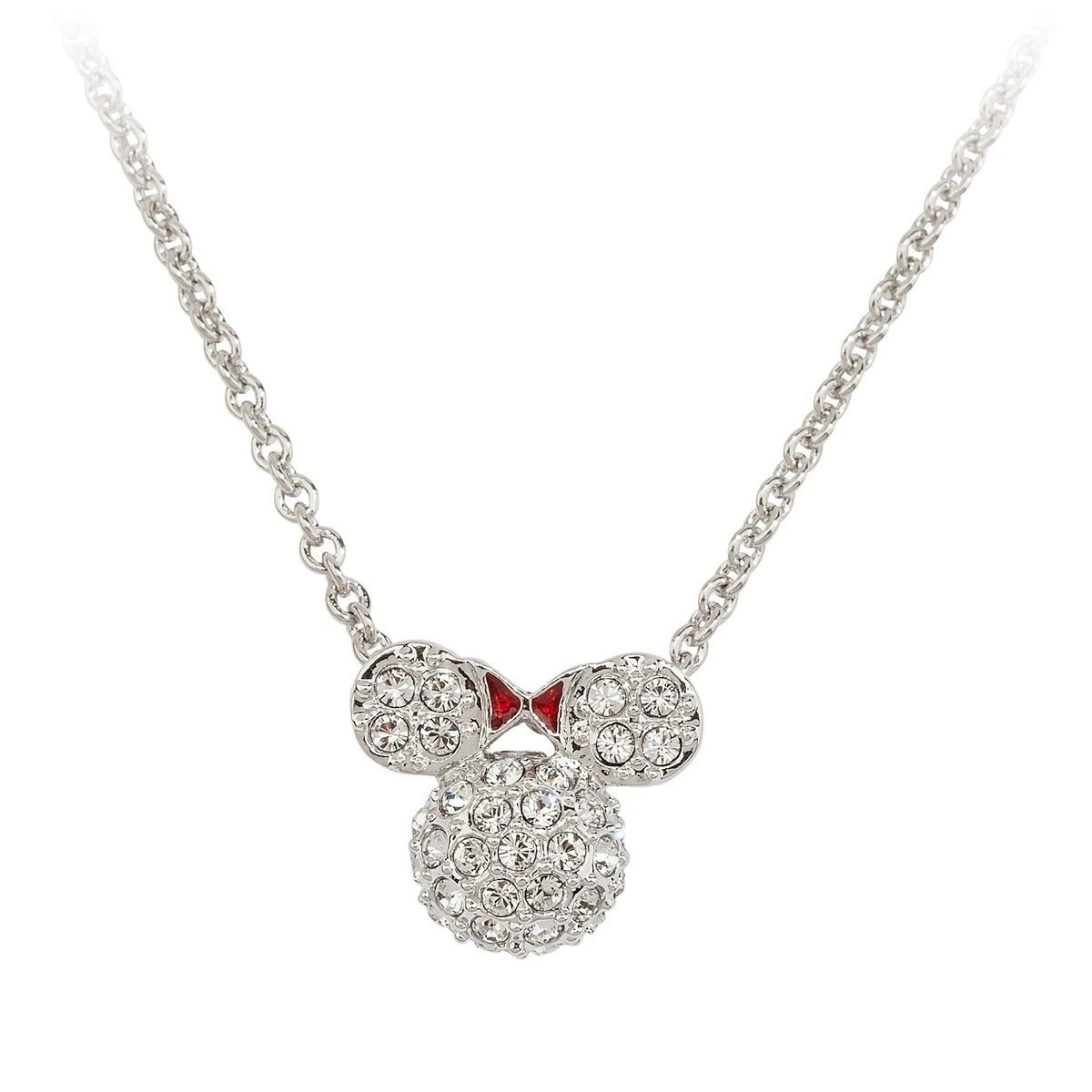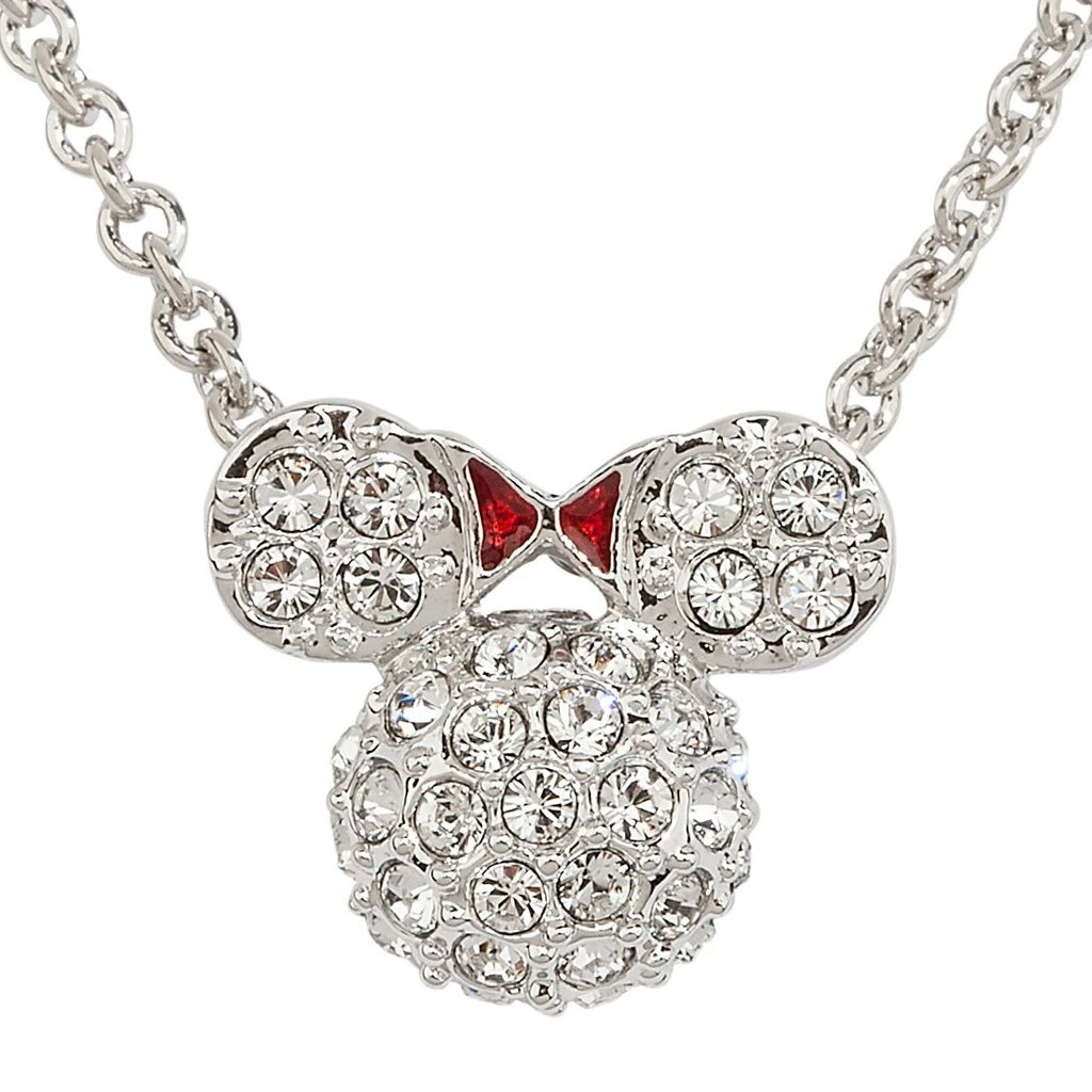 Minnie’s iconic likeness is formed in a raised dome profile encrusted with sparkling Swarovski crystals and accented with her famous red bow. Enjoy a glamorous reminder of your trip to the Park when you wear this pavé necklace.