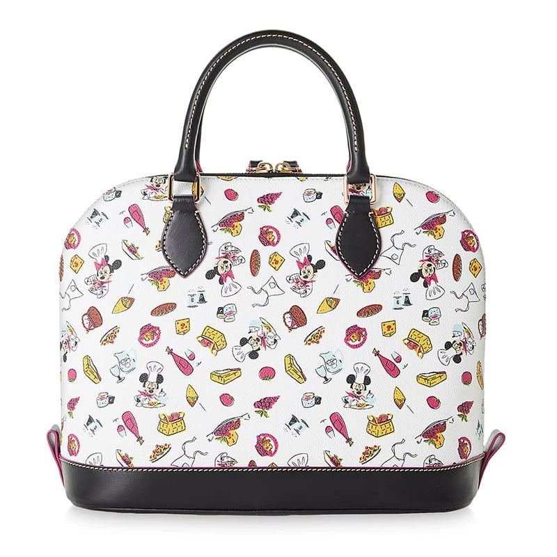 Show off your refined taste with this stylish Epcot International Food & Wine Festival satchel by Dooney & Bourke. Featuring screen art of Chef Mickey, Chef Minnie and lots of yummy foods, this handy bag has room for all your daily essentials.
