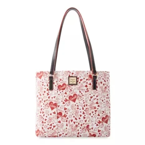 Birds of a feather stick together, especially when they’re ”wild about” each other like Donald and Daisy. The loving couple is featured surrounded by hearts in the romantic allover design of this simulated leather tote bag from Dooney & Bourke.