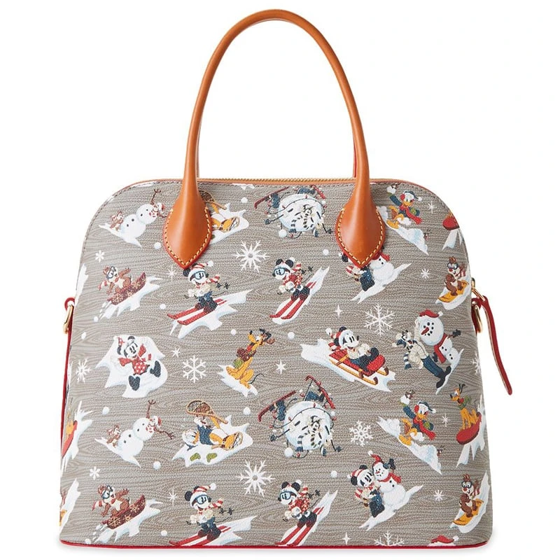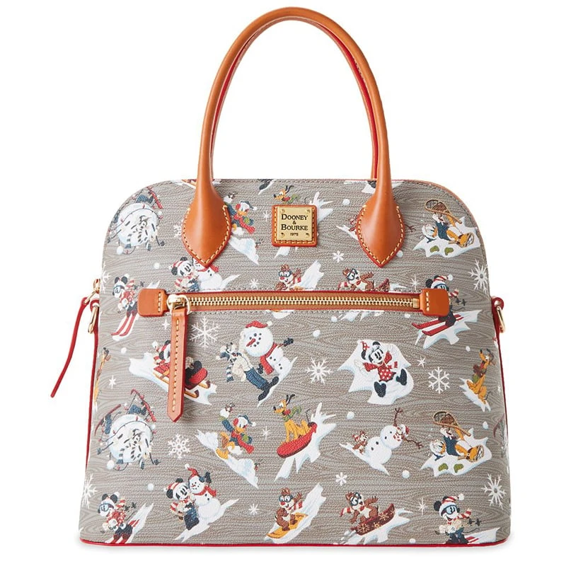 Celebrate the magic of the winter season with this stylish dome satchel from Dooney & Bourke. Featuring an allover pattern of Mickey, Minnie, Donald, Goofy, Pluto, and Chip ‘n Dale frolicking amid a flurry of snowflakes against a wood grain design, this jolly bag features a zippered main compartment with multiple pockets, a removable shoulder strap, and top carry handles.