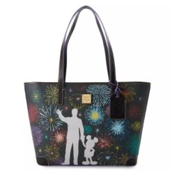 The celebration of the century carries on in style with this enchanting Walt Disney and Mickey Mouse ”Partners” Dooney & Bourke tote bag. Part of the Disney100 Platinum Celebration Finale Collection, it captures the thrill and excitement of the fireworks spectacular with dazzling allover screen art. Highlighting this chic and convenient carryall are large metallic silhouettes of the ”Partners” statue on one side and Fantasyland Castle on the other. With signature Dooney & Bourke elements, it is cause for celebration every time you pick it up.
