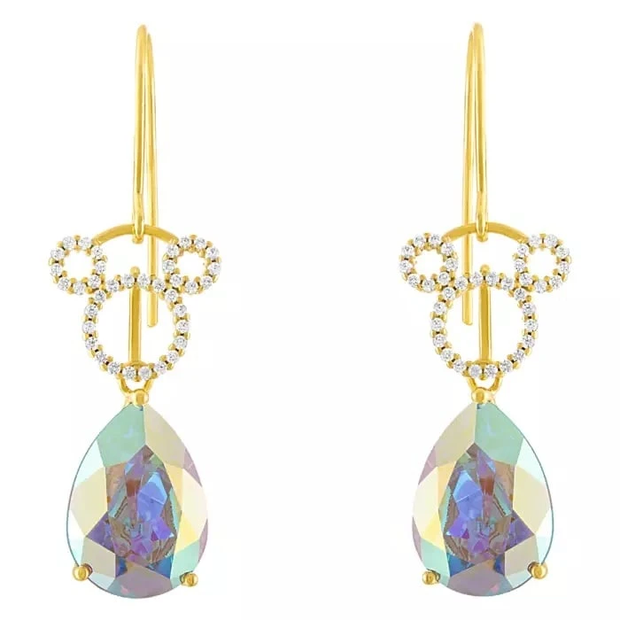 Crafted from sterling silver, these drop earrings by designer Rebecca Hook feature dazzling cubic zirconia-encrusted Mickey Mouse icons and teardrop Swarovski ”Aurora Borealis” stones for a chic style statement.