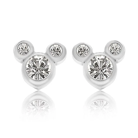 Sterling silver forms the Mickey Mouse icon setting for these earrings that sparkle with cubic zirconia. The little stud earrings come in an elegant presentation box covered in gold Mickey icons that make it the perfect gift.