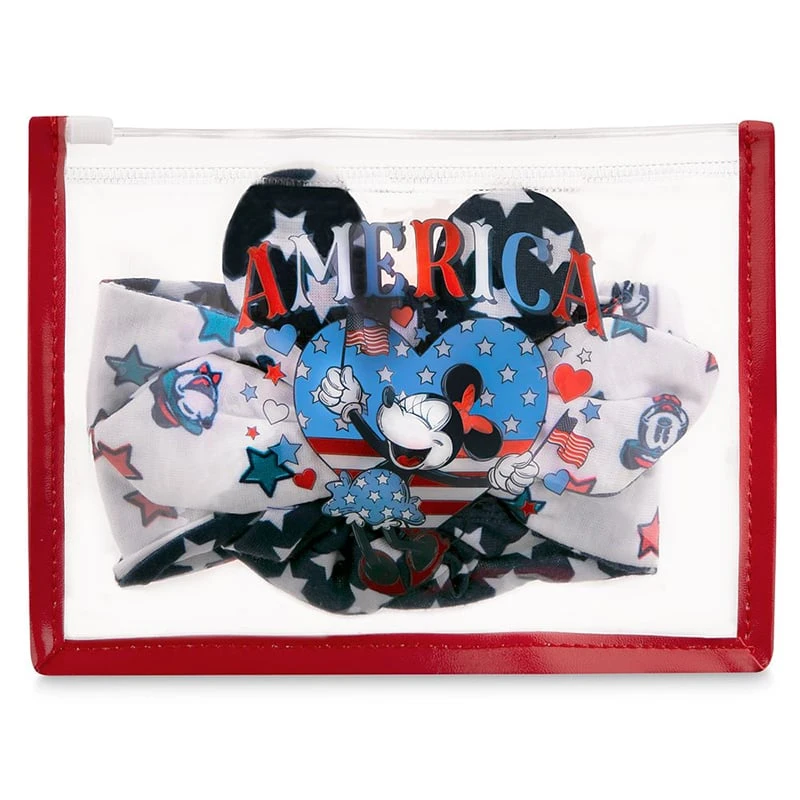 Ladies of Liberty can top off their crown with Minnie’s star-spangled hair set including head wrap with bow plus mouse-eared scrunchie, both with an Old Glory theme.