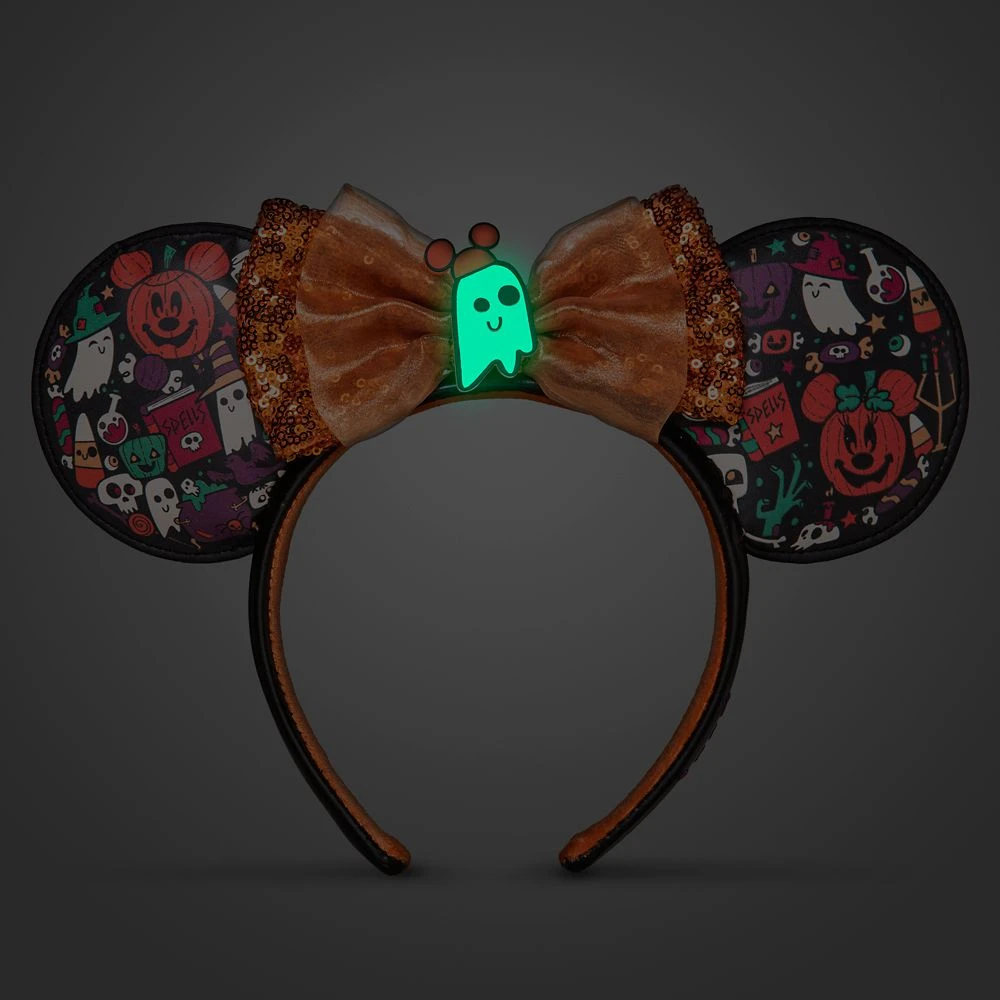 You won’t need tricks to look like a treat in this Minnie Mouse Halloween headband featuring an orange sequined bow with glow-in-the-dark ghost at the center.