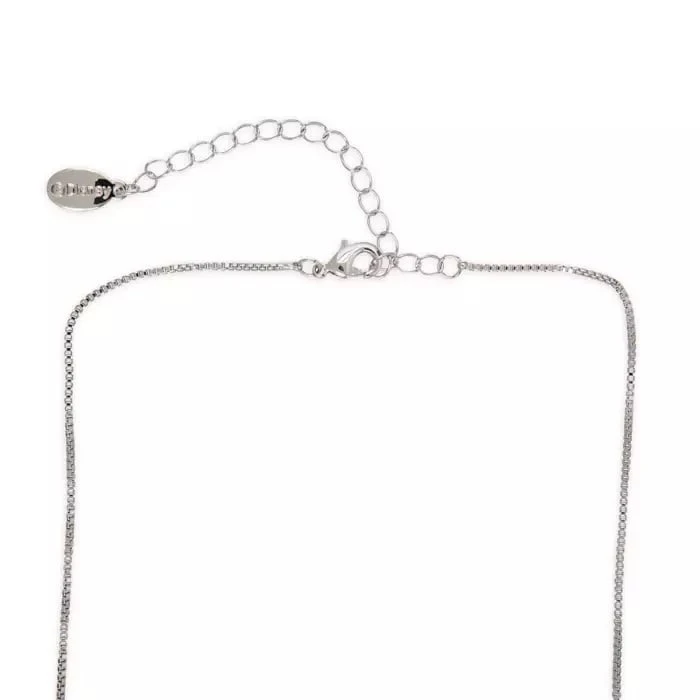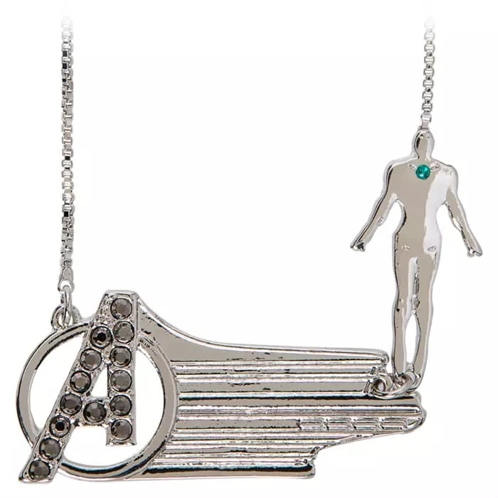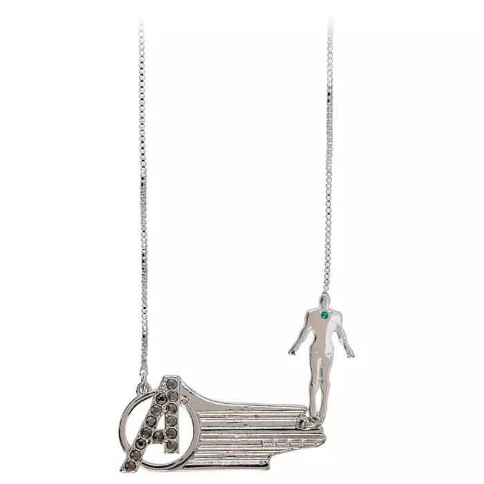 Show off your super hero style with this gleaming necklace. It features the Avengers logo with black acrylic crystals and an Iron Man charm with a blue acrylic crystal, so you can show off your love for Earth’s Mightiest Heroes.