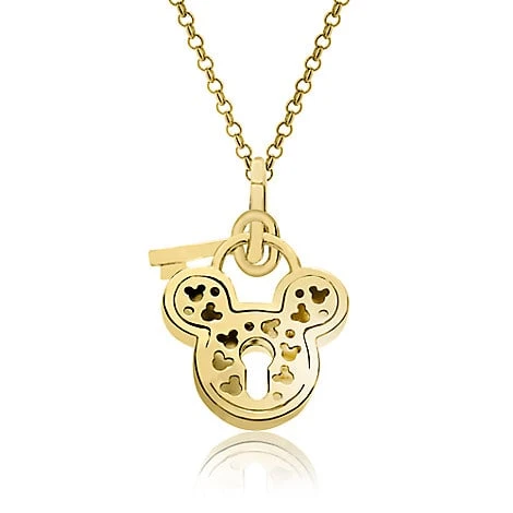 There’s no shortage of sparkle on this dazzling Mickey Mouse necklace. It’s decorated with cubic zirconia accents on one side, tiny Mickey details on the other, topped with a special key charm, and fully covered in 18K gold plating.
