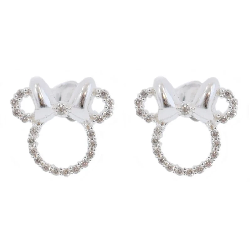 Minnie brings her dazzling sense of style to these elegant earrings. Her distinctive icon is outlined in sparkling cubic zirconia and topped off with her signature bow in beautiful silver plating.