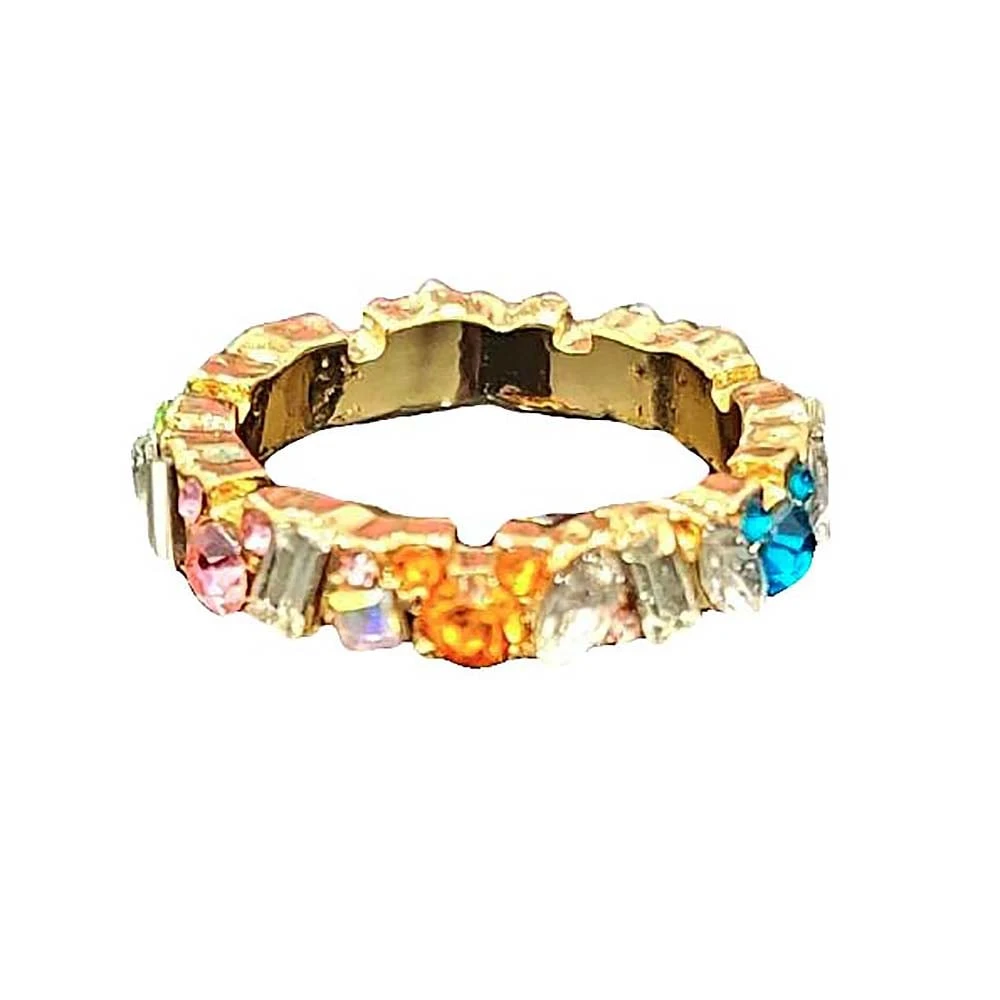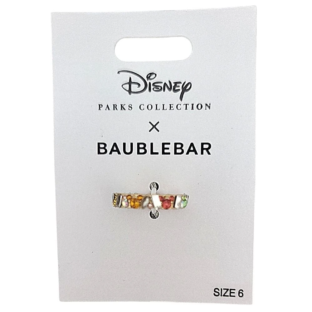 Mickey is on hand to bring his colorful personality to this dazzling ring by BaubleBar. The golden band is inset with multiple Mickey icons fashioned from faceted glass and faceted glass marquis, square, and baguette shaped stones.