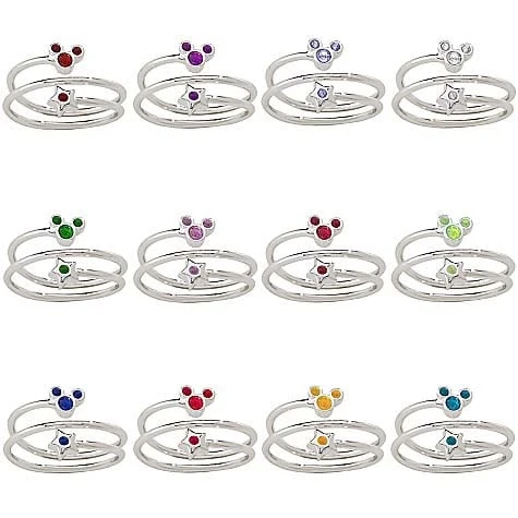 This Star and Mickey Mouse Birthstone Ring wraps around your finger with a Mickey Mouse head icon, silver band in the center and star. Your birthstone decorates Mickey’s ears and head and the star’s center to celebrate you and your birth month.