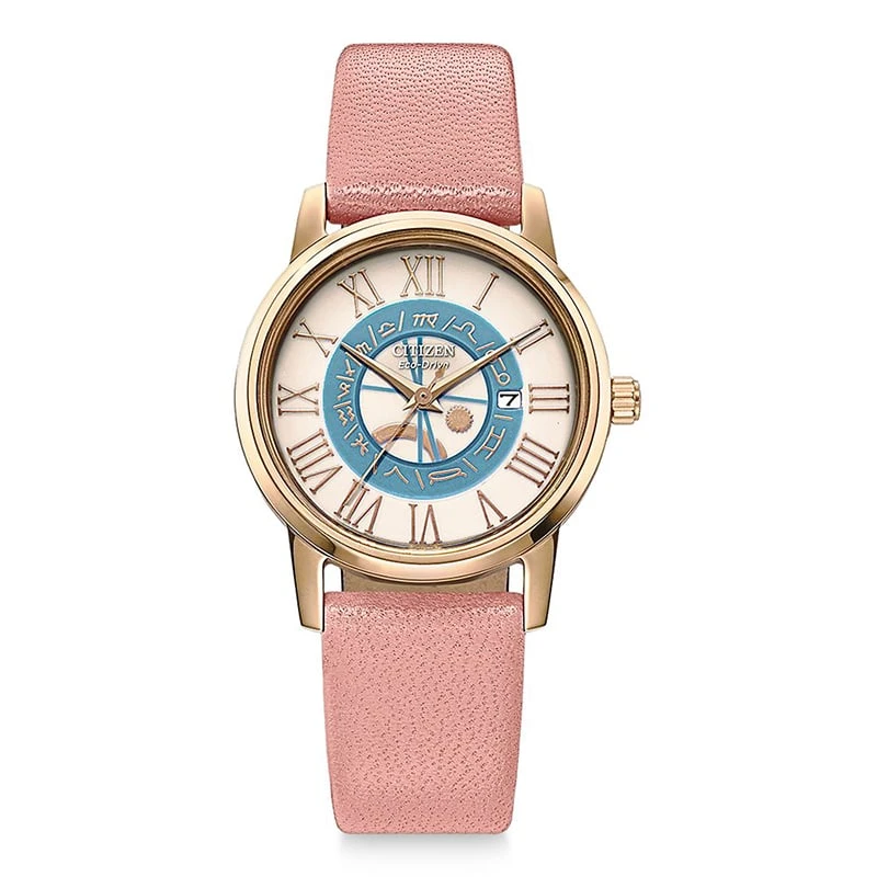 Walt Disney’s classic film Sleeping Beauty comes alive in this limited edition watch from Citizen. The original watch face design was inspired by Sleeping Beauty Castle at Disneyland. Sold exclusively by Disney, this ladies’ timepiece features a rose-gold tone stainless-steel case and pink leather strap.