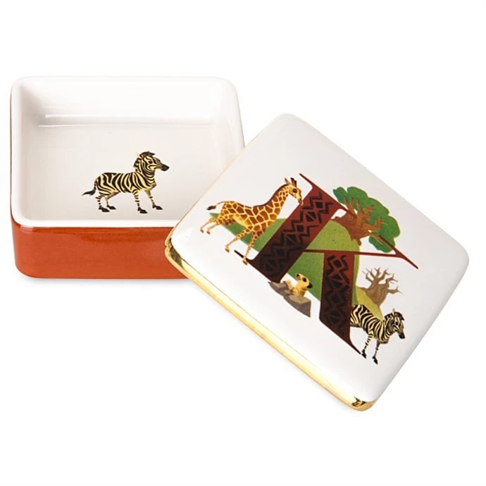 K is for Kilimanjaro Safaris on this trinket dish that makes storing small treasures a truly wild adventure. The gold edged ceramic decor item features exterior and interior designs inspired by the scenic landscapes of Disney Animal Kingdom at Walt Disney World.