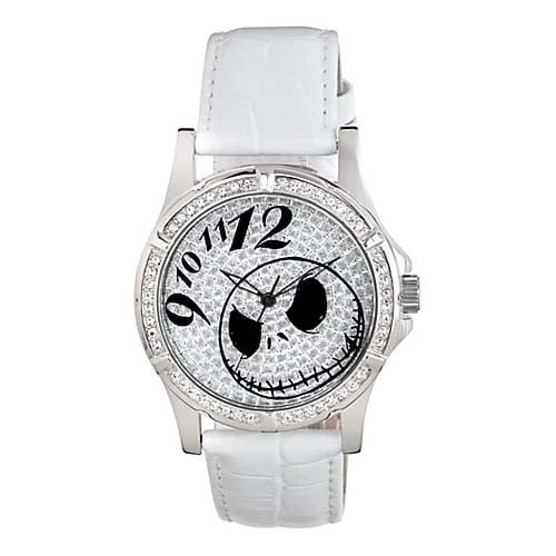 Sparkling snowdrop crystals creep in and around this Jack Skellington Watch for Women which features Tim Burton’s favorite Pumpkin King in line art on the glass face. Genuine leather strap displays a ghastly, ghostly pallor quite unlike the usual gator.